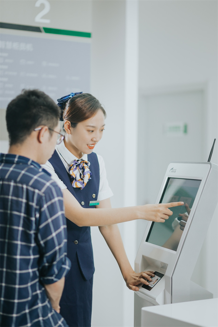 图:柜面服务人员为老年客户介绍适老化服务设施