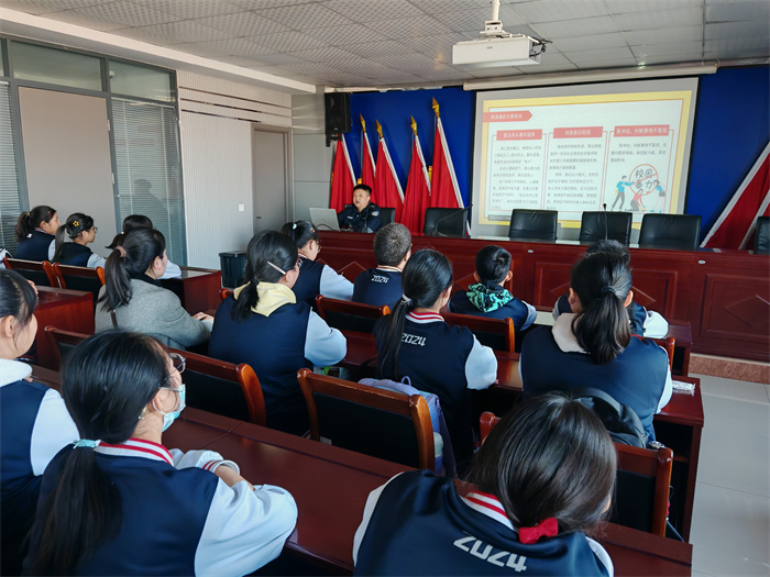 活动伊始,在师生的注视中,警犬精彩的技能展示瞬间点燃全场气氛,在民警的指令下,警犬机敏地完成各项动作,又萌又飒的样子瞬间收获了现场师生们的阵阵掌声。随后,在胶州市公安局“义警联盟”志愿者的介绍下,师生有序参观了各类救援装备,部分同学还有机会亲手触摸、试穿和体验部分装备,在民警的专业指导和保障下,现场氛围热烈,各类安全知识深入人心。走进派出所的综合指挥室,同学们见识到了公安工作的“智慧中枢”,民警用生动易懂的语言,为大家讲解了指挥室的日常运行机制和接处警流程。在看到辖区实时画面呈现在大屏幕上时,同学们直观感受到了科技强警的力量,随后民警也耐心地回答了同学们的各类关于公安工作的问题。活动的最后一站,是备受关注的反校园欺凌专题讲座。民警结合中学生的年龄和心理特点,通过真实案例、通俗语言,利用专业的安全知识,为同学们深入浅出地剖析了校园欺凌的具体表现形式,以及带来的严重危害与可能承担的法律后果,并重点讲解了如何有效预防和应对校园欺凌,鼓励同学们要学会运用法律武器,保护自己和他人的合法权益。