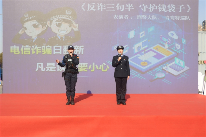 青鸾特巡队带来的警体拳表演将现场气氛推向高潮,队员们动作整齐划一、气势如虹,充分展现了公安队伍的过硬素质和良好形象,赢得了现场观众的满堂喝彩。在互动宣讲环节,交管大队民警结合案例讲解交通安全,而刑警队员则带来了朗朗上口的反诈“三句半”,经侦大队民警通过趣味互动揭秘涉众经济犯罪陷阱,实现了交通、反诈、防非宣传的“一站式”融合教育,让安全知识更加深入人心。