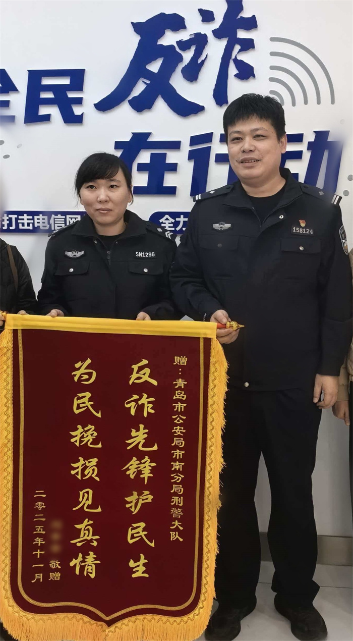 “太感谢你们了!这可是我们家的全部积蓄!”11月28日,市民李女士带着家人来到市南分局刑侦大队反诈中心。他们送上锦旗,紧紧握着民警的手反复道谢。这背后,是一场与诈骗分子的“极速赛跑”。
