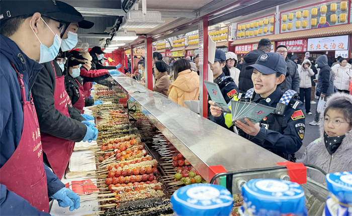 清晨6时,天刚蒙蒙亮,市北公安分局兴隆路派出所社区民警聂昌青已穿戴整齐。作为有着21年糖球会安保经验的“老把式”,他熟悉这里的每一条街巷,对核心区域的摊位位置更是了如指掌,甚至能叫出许多老商户的名字——这份熟稔,是岁月沉淀下的安心。他的第一个任务是带队巡查会场消防设施。“糖球摊位多用电,美食区明火集中,每一个灭火器都得确保能正常使用。”聂昌青手持检查登记簿,逐一向摊主强调安全规范,袖口的警徽在晨光中熠熠生辉。在高家糖球摊位前,他细心提醒传承人高师傅:“糖浆熬制时别离人,电线要远离热源,有任何情况随时喊我们。”
