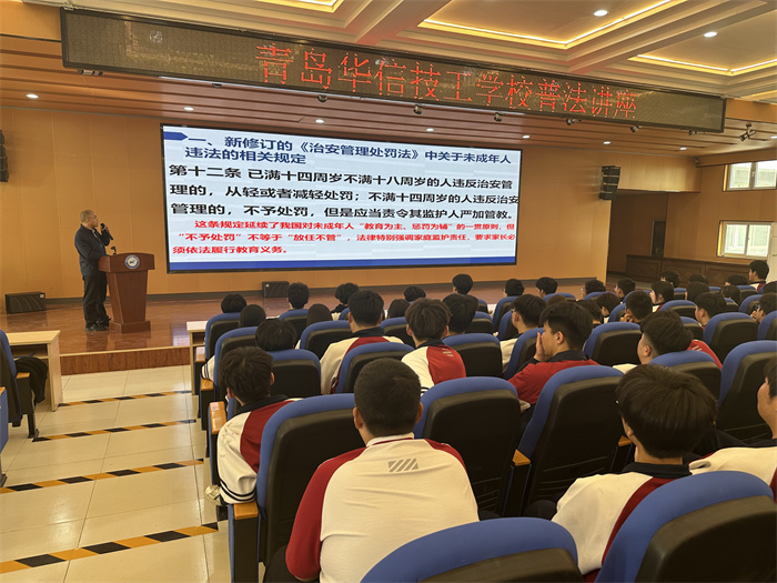 为进一步增强青少年法治观念,预防未成年人违法犯罪,4 月 14 日,胶州市司法局铺集司法所邀请胶州市蓝马甲普法志愿讲师、山东青凯律师事务所逄金亮律师走进青岛华信技工学校,为高一年级160名学生开展“青春无殇,永远不‘刑’”主题普法宣传讲座。讲座围绕未成年人法律责任、常见犯罪风险、校园安全防范等内容以案释法,引导学生学法守法、远离违法犯罪,用法治守护青春成长。