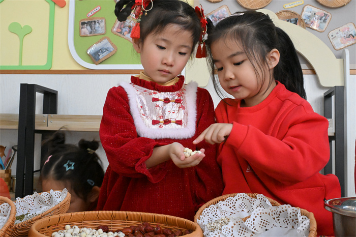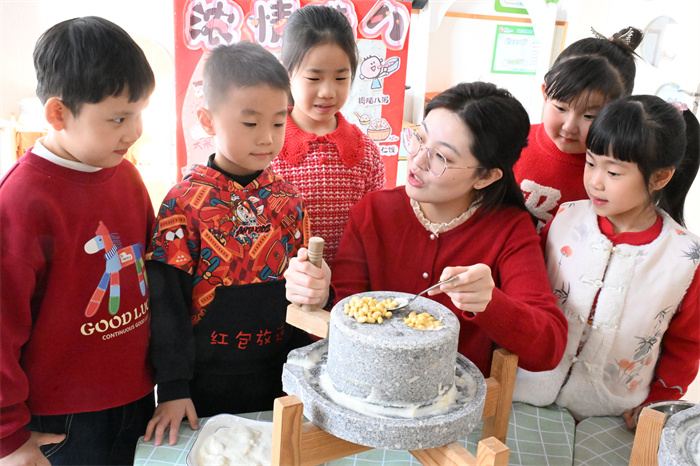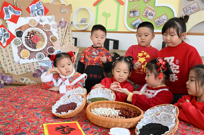 “小孩小孩你别馋,过了腊八就是年……”1月23日,山东省青岛市即墨区皋虞路幼儿园里一片欢声笑语,幼儿们在老师的精心组织下,沉浸式体验中国传统节日腊八的独特魅力。