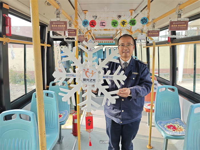 大雪至,寒意浓,青岛城运城阳巴士第十三分公司374路公交车变身“暖冬移动空间”,驾驶员邱月山以雪花为媒、萤火为魂,打造了充满节气氛围与企业文化的主题车厢,让乘客在出行途中感受双倍温暖。