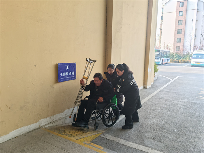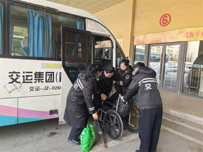 当日上午,载着张先生的黄岛至胶州客运班车驶入胶州汽车总站。车刚停稳,提前接到对接信息的胶州站工作人员范娜和王慧已等候在车门旁,一人扶稳张先生的轮椅,一人轻托他的后背,配合着将他从班车上平稳转移到轮椅上;驾驶员师傅则顺手拎过他脚边的绿色行李袋,快步在前引导至换乘候车区。