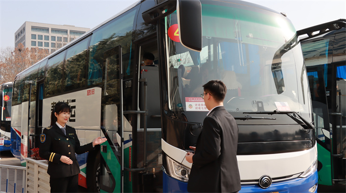 现场跟进,保障到位。会议期间,印有“青岛城运”和“诚载美好”标识的大巴整齐列队、整装待发。驾驶员与乘务员仪表整洁、规范站位,以热情主动的服务迎接代表委员,在寒冬中传递出真挚的“城运温度”,充分展现了“行必速、做必成、战必胜”的城运作风。