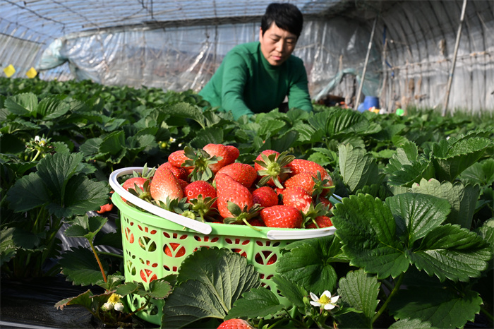近日,山东省青岛市即墨区灵山街道草莓种植大棚中的草莓进入成熟期,当地果农采摘分拣草莓,供应春节市场,丰富节日果盘子。