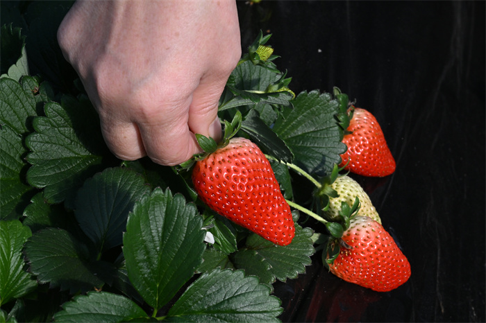 田垄上红绿相衬,绿油油的茎叶间挂满了红彤彤的草莓,还有嫩黄的花朵点缀其间,一颗颗草莓鲜红饱满,格外惹人喜爱。草莓种植户姜万山正在采摘草莓,他笑着称今年草莓的整体长势良好,大棚内光照充足,温度和湿度都得到了精确控制,为草莓提供了良好的生长环境。