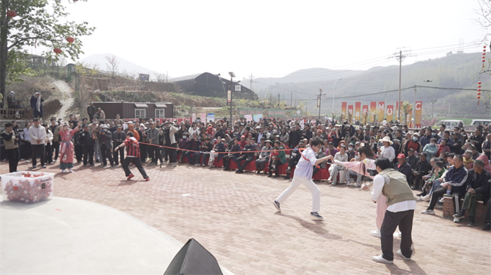 现场趣味互动精彩纷呈。在爱情公路沿线霞峰观景台,一棵盛开的巨型桃花树下挂满了粉色花环,与“桃小主”“桃花弓手”等NPC趣味互动,参与桃花弓射箭游戏,赢取定制冰箱贴等精美礼品,拍照打卡、乐趣十足;双人趣味 “村拔” 活动热闹开赛,游客两两一组、齐心协力,在欢声笑语中比拼力量、增进情谊,成为现场一道欢乐风景线。
