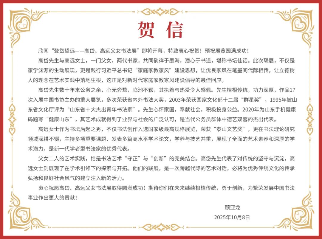 中国书法家协会副主席、山东省书法家协会名誉主席顾亚龙贺信