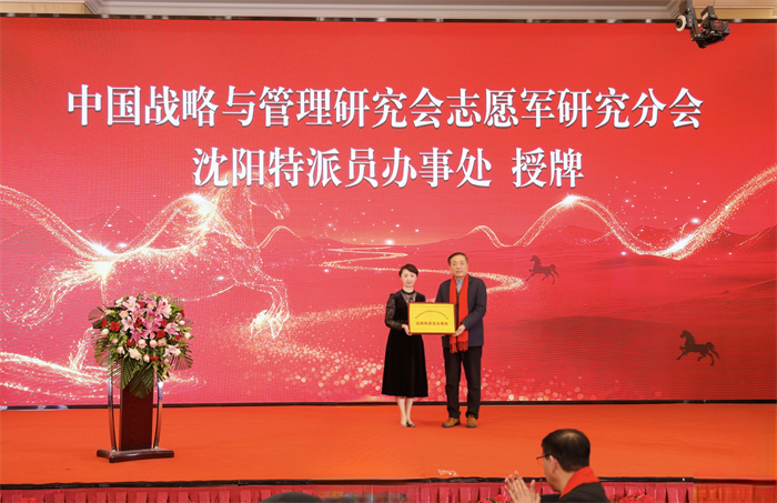 中国战略与管理研究会志愿军研究分会副会长徐彬登台致辞,为沈阳特派员办事处秘书长于佳丽授牌。随后,沈阳市抗美援朝烈士陵园管理中心副主任黄跃义、辽宁省国防教育基金会理事长陈美霖、陕西英才人物南启祥将军等领导嘉宾依次致辞,凝聚致敬英雄、携手奋进的共识。