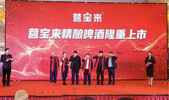 营宝来精酿啤酒新品发布环节。由贺小民、杨建科、李虹达、段成亮、王鹤晓、逄萍六位嘉宾共同举杯,宣布营宝来德式精酿啤酒隆重上市,正式揭开营宝来健康产业,面向全国诚招代理商的序幕。