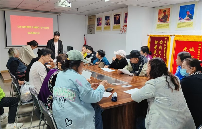 10 月 13 日,宜昌路社区以 “学纲要、强法治、促发展” 为主题,在社区活动室开展多维度宣传活动,18 名居民踊跃参与。社区工作人员深入解读纲要精神,推动法治宣传融入日常,将学习成果转化为基层治理的具体行动,让法治成为社区治理的鲜明底色。