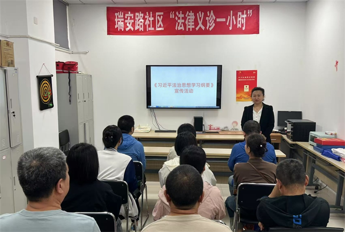 同日,瑞安路社区在社区活动室同步开展专题宣传,15 名辖区群众参与学习。社区法律带头人张晓䴖聚焦纲要核心要旨与重要意义,强调 “学习领会习近平法治思想是当前和今后一个时期的重大政治任务”,引导群众吃透精神实质、把握实践要求。活动还结合 “法律义诊一小时” 特色环节,切实提升了群众的法治意识与素养,营造出 “遵法、学法、守法、用法” 的浓厚氛围。
