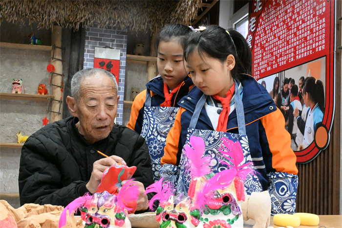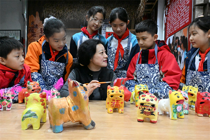 “泥老虎的嘴部和眼睛要用黑色来表现;老虎的额骨、鼻子和口表现为红色以示喜庆和威严。” 12月23日,在山东省青岛市即墨区创智实验学校的泥塑教室里,非遗传承“守”艺人于正寿正在给孩子们介绍如何给泥老虎上色。