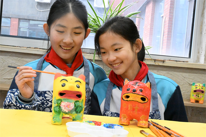 同学们借助手中的画笔和颜料,自由绘制出一只富有童趣、属于自己的泥老虎。拿着头和尾挤压后,脆亮亮的响声、憨态可掬的模样让孩子们爱不释手。孩子们所绘的每一笔,每一色,寄予的都是对顺遂、安康和吉祥的美好愿望。孩子们不仅体验了传统民俗艺术的魅力,更收获了最简单纯粹的快乐。