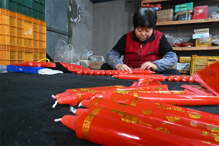 王际昌手里的大红蜡烛引起了记者的注意,“新人结婚、过年时家里摆上这样一对大红蜡烛,喜庆又热闹,而且蜡烛还可以根据客户要求单独定制,十分受市场欢迎。”王际昌笑呵呵地说道。