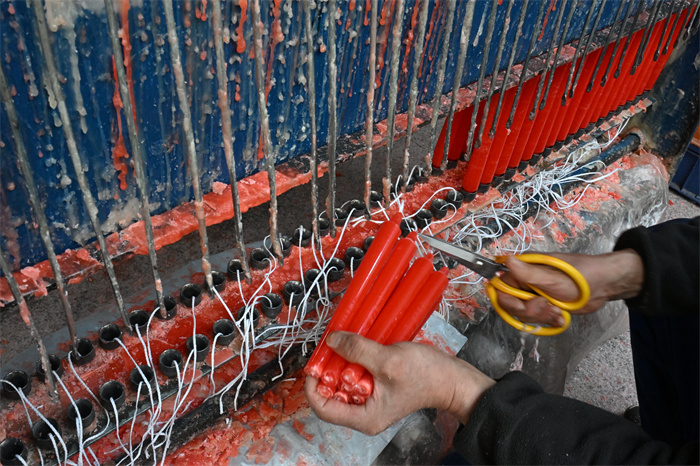 据介绍,一只蜡烛大约要经过化蜡、加色、塑形、冷却、烫金或滚膜、包装等10余道工序才能制作完成,每道工序都至关重要,否则就容易出现质量问题。“化蜡是第一步,温度必须掌握好,因为做蜡烛用的石蜡具有一定的危险性,所以要非常谨慎。”今年61岁的王际昌从事红蜡烛加工制作已经40多个年头了。“从我爷爷那一辈,家里就开始制作红蜡烛,可以说是从祖辈传承下来的手工艺。我从十多岁就跟着父亲学手艺,这一干就是40多年。”王际昌告诉记者。40多多年蜡烛制作经历,对于制作工艺早已了然于心。王际昌说,加色也是一个很关键的步骤,要掌握好适宜的色度,精确控制石蜡和染料的比例,“没有别的方法,全靠几十年制蜡经验的积累”。