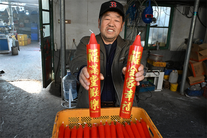 “快来看看我制作的大红蜡烛。这一支蜡烛就有1斤重。”1月13日,冬日和煦的阳光照在山东省青岛市即墨区段泊岚镇西大于庄村农民王际昌的农家小院。