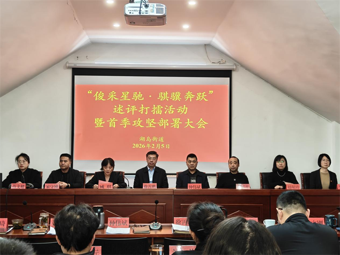 2月5日,市北区湖岛街道召开“俊采星驰・骐骥奔跃”述评打擂活动暨首季攻坚部署大会。街道全体工作人员和各社区书记参会。会议由党工委副书记臧琪主持,党工委书记徐霄鹏作总结动员讲话。各科室用鲜活的工作数据和案例亮成果,谋创新、定策略,分管领导逐一点评提要求,街道主要负责同志、分管负责同志、科室负责人和社区书记分类打分、综合评价,“打擂”现场学习比拼氛围浓厚、热情高涨。