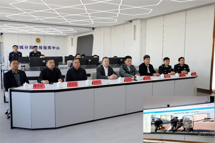 在分局情报指挥中心,翟立波同志、程学锋同志一行观看了分局特巡警大队应急处突、社会面巡逻防控等方面的工作演练汇报,观看了分局2025年度汇报片。
