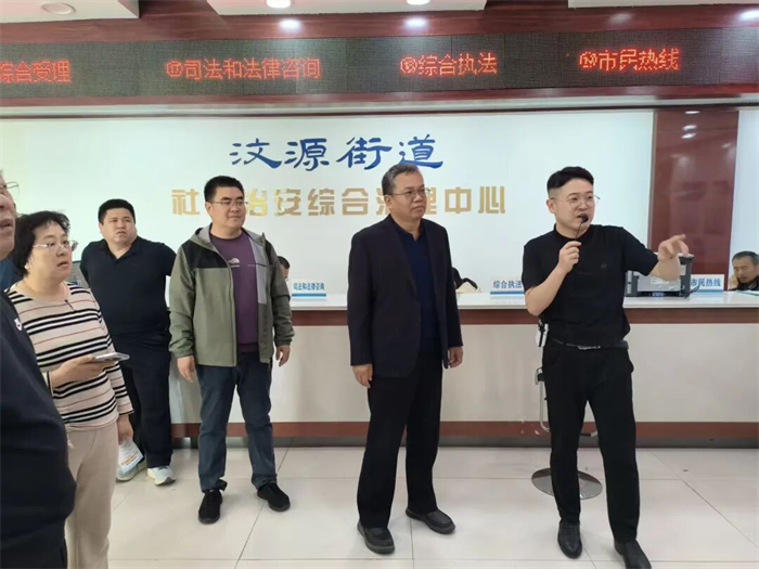 调研组首先来到汶源街道综治中心,详细查看中心功能布局、阵地建设、人员配备情况,认真听取街道综治中心 “1253” 工作法、“周个案、月总结、季通报” 矛盾纠纷调处工作制度的经验介绍,深入了解街道在矛盾纠纷源头预防、前端化解、闭环管理方面的创新实践。
