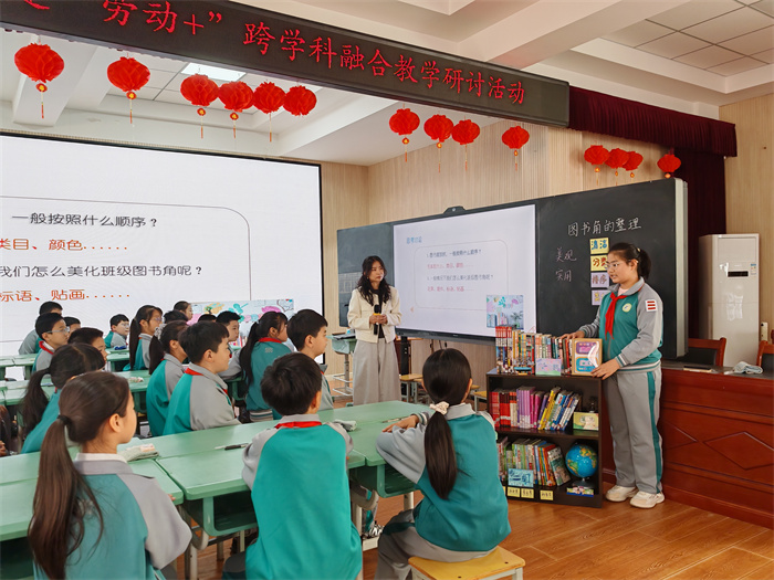 活动伊始,张文冬老师带来的《整理图书角》融合课如春风拂面。课堂以“感受古今不同美”开篇,张老师通过展示古代书房的雅致与现代图书角的有序,展示学生的优秀习作《我的乐园——图书角》,引导学生体会书籍承载的文化之美。随后通过展示“有问题的图书角”,将视角拉回现实——杂乱的图书角引发学生共鸣,大家纷纷讨论“如何让图书角重焕生机”,让学生感受整理班级图书角的必要性。在“我是小小整理员”实践活动环节中,学生们分步骤整理:先擦拭书架,再书籍贴标签,按童话、科普、名著等类别分类图,最后用创意标签排序美化角落。当原本凌乱的图书角变得整齐美观,孩子们眼中闪烁着劳动的自豪与成长的喜悦,语文的人文性与劳动的实践性在此完美交融。