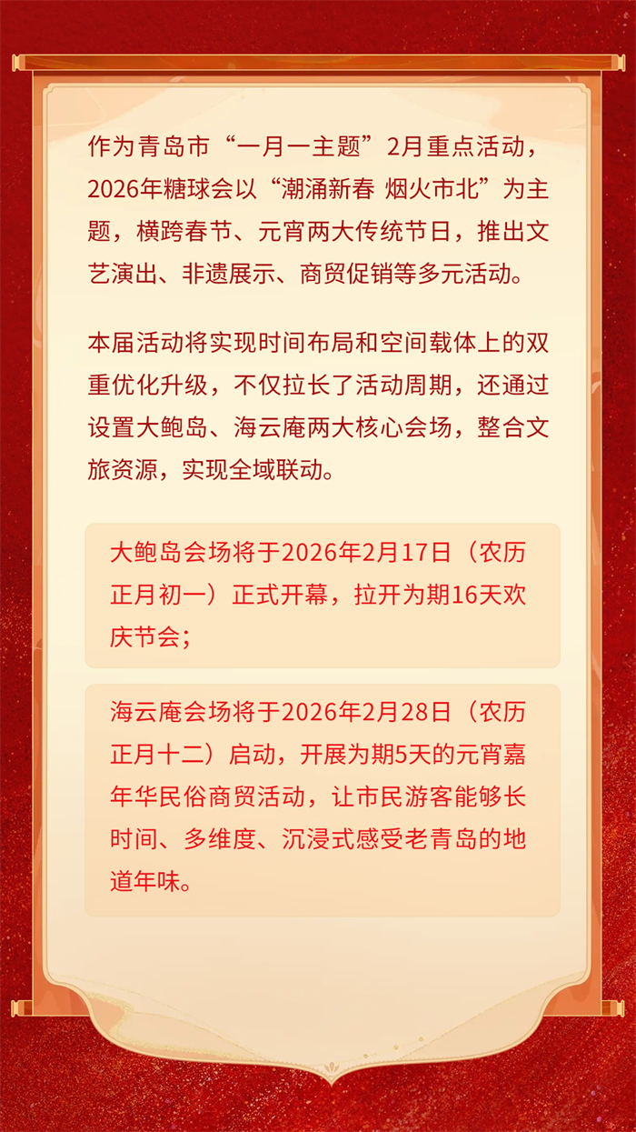 在此发布2026年糖球会的活动安排,并向全市人民、海内外游客朋友发出最热情的新春邀约——诚邀大家共赴这场传统与时尚碰撞、民俗与潮流共舞的年度盛宴,一起在青岛、在市北过个热热闹闹的吉祥年!