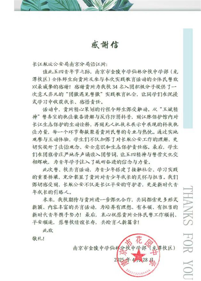 活动结束后,校方向长江航运公安局南京分局沿江所发来了感谢信,对此次实践教育活动表示高度认可和衷心感谢。信中提到,此次警、校共育活动,为青少年搭建了接触社会、学习实践的重要桥梁,充分彰显了沿江所对青少年成长的关怀与担当。深切感受到,长航公安不仅是长江平安的守护者,更是新时代青年成长的引路人。希望今后能继续加强警、校合作,共绘育人新篇章!(黄绍琦 崔书馨)