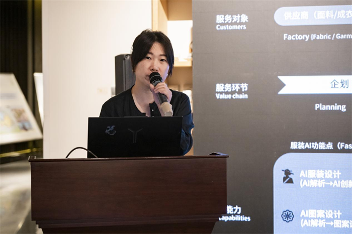 青岛三态比特科技有限公司副总裁王文丽女士则是以“服装智能生成时代的产业新机遇”为题,分享了为服装行业提供的全链路综合AI技术解决方案。