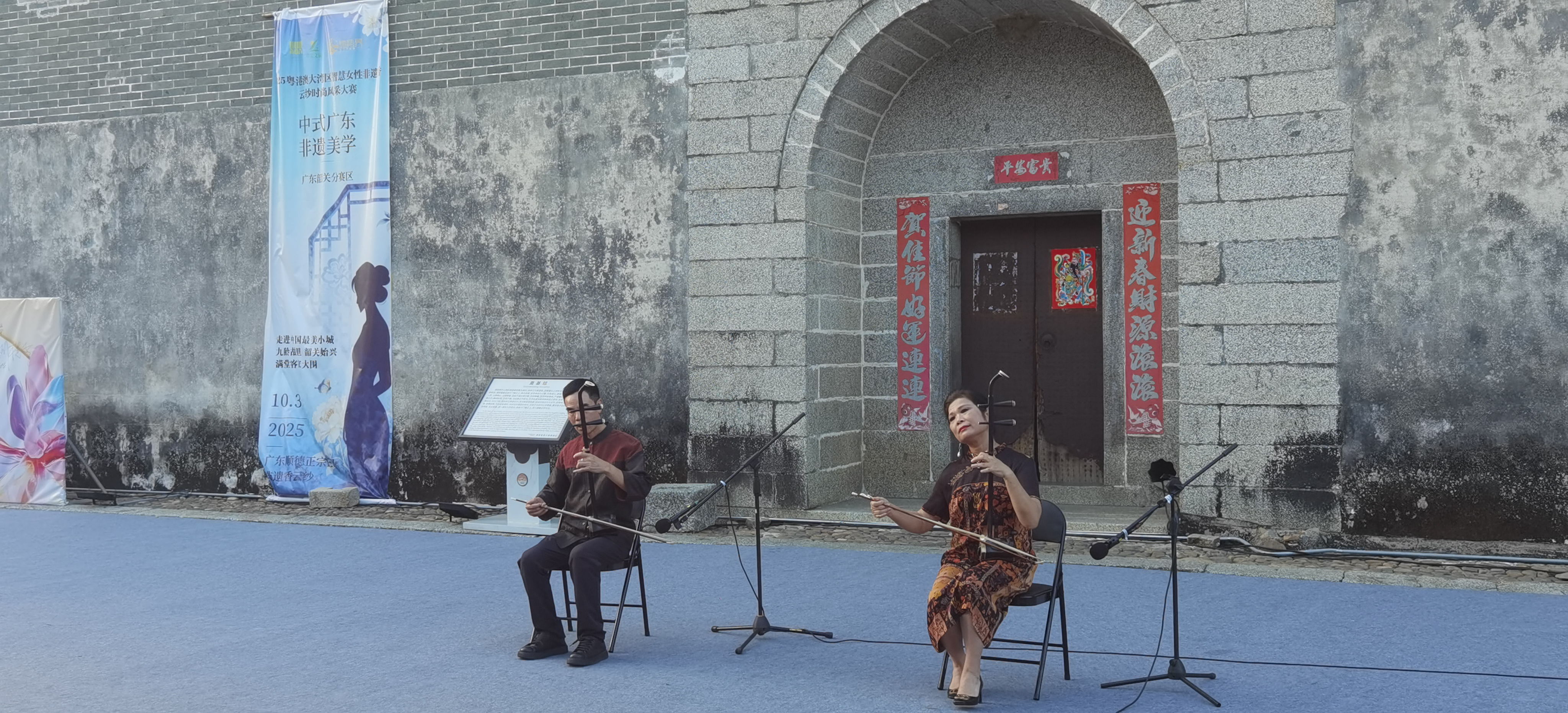 活动现场文化氛围浓厚,佛山顺德香云纱传承人周振权现场展示非遗技艺,让观众近距离感受 “软黄金” 的制作奥秘。《畲族彩带舞》以图腾纹样与现代舞美的碰撞拉开序幕,韶关市南国风采艺术团的旗袍折扇秀《梨花千古》、广州云山空灵鼓团队的《彩云追月》接连上演,国家一级演奏员黄江琴带来的跨界胡琴演奏更是将活动推向高潮,三首跨越民歌、传统与流行的曲目,完美诠释了非遗文化的当代生命力。“艺术工作者深入生活、扎根人民,艺术才会生生不息。” 黄江琴在演出后盛赞始兴的文化底蕴,直言将持续助力古县文化传播。