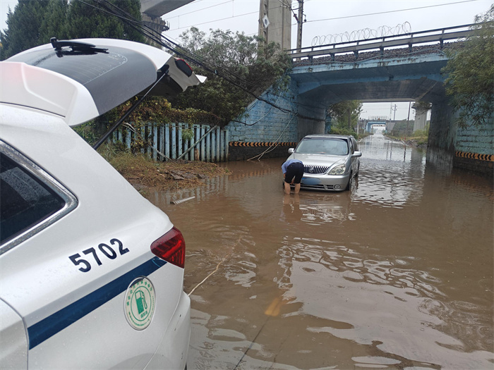 10月5日9时许,胶州市公安局马店派出所巡逻队员在执行日常巡查任务时,发现管路村附近桥洞子因降雨导致积水,一辆车在驶过桥洞途中呛水熄火,见此情形,民辅警立即展开救援。他们挽起裤腿、脱下鞋子踏入水中,将牵引绳固定在车辆前部。一名巡逻队员驾驶警车缓慢牵引,其余队员在车后协助推车。经过警民协作,成功将车辆推至安全区域。车主连声道谢:“没想到警察同志这么快就赶来帮忙,太感谢了!”