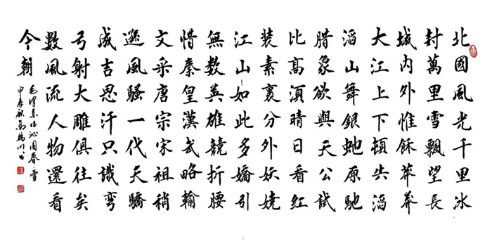此次展出的数十幅作品,恰是他半生艺术追求的凝练:既有亮相 2025 年青岛上合之珠展览的 “琴鸣四海 翰墨同心”“丝路连心”,笔势开阔如山海,藏 “和合共生” 的时代意涵;亦有 2024 年 11 月入藏陕西延安干部学院的楷书《沁园春・雪》,墨色浓淡间,尽展伟人 “数风流人物,还看今朝” 的胸襟;更有 “国泰民安”“祖国昌盛” 等寄寓家国情怀的力作,以及 “厚德载物”、“养德泽福” 等浸润国学智慧的精品。