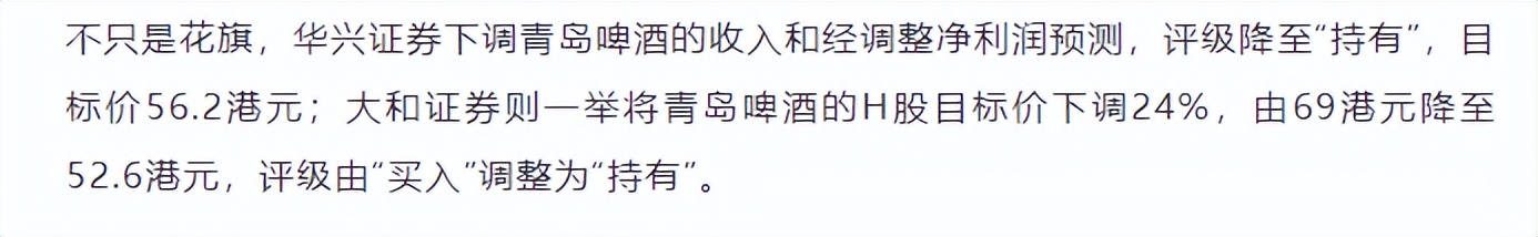 华兴证券下调青岛啤酒的收入和经调整净利润预测,评级降至“持有”;大和证券则一举将青岛啤酒的H股目标价下调24%,评级由“买入”调整为“持有”。