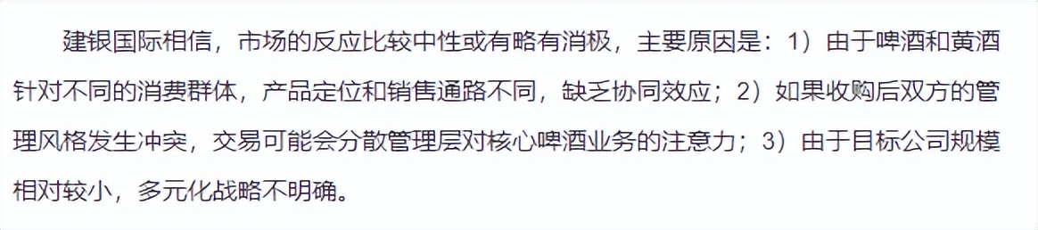 建银国际在研报中明确指出,啤酒与黄酒的销售通路存在差异,协同效应存疑,而且交易还可能会分散管理层对核心啤酒业务的注意力。