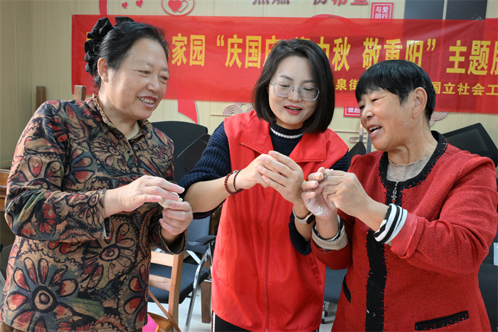 “重阳蛋糕想做得好吃,原料准备尤其关键,大米粉和糯米粉要按3∶7的比例混合而成,这样蒸出来的重阳蛋糕才会色泽如玉。”社区志愿者面点师正在现场示范制糕窍门,老人们也兴致勃勃按捺不住地加入进来,一试身手。重阳蛋糕象征“百事俱高”的祝福之意,也有“迎福接吉”的寓意,既是向重阳节献礼,也是为老人们献上一份美好的祝福。活动现场,国立巾帼志愿者们为社区老人准备了重阳糕,欢快的场面让现场热闹起来。