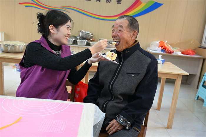岁岁重阳,今又重阳。10月29日,天气晴朗。“刘奶奶,今天是重阳节,咱区里为老人们一起过节庆祝生日,您快尝尝蛋糕!”。在山东省青岛市即墨区龙泉街道天一仁和郡社区,即墨区国立巾帼志愿者纪裕菲正给社区的78岁的刘美玉老人送上重阳蛋糕。