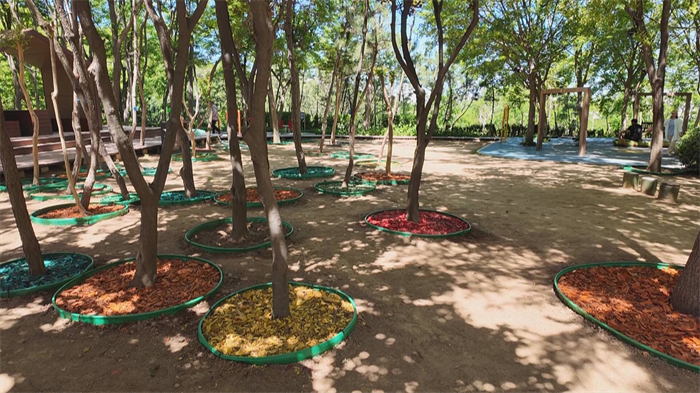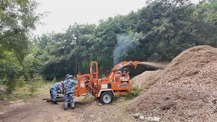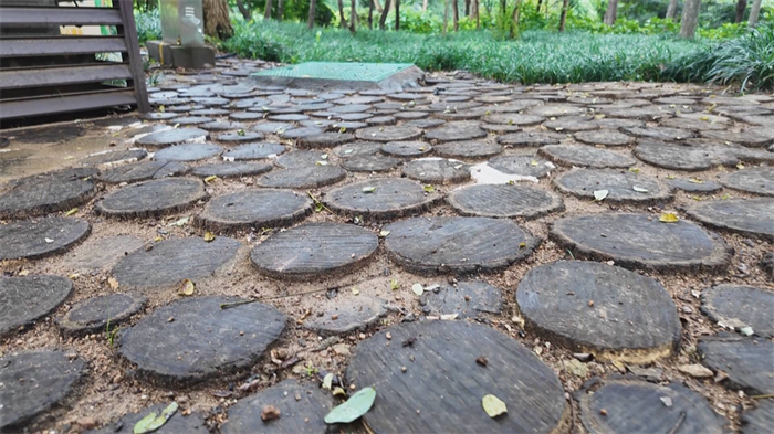 然而,森林质量提升过程会产生大量的树枝、枯叶等废弃物。在过去,这些废弃物清运起来既费钱又占地。如今,浮山森林公园崂山园区有了治理“妙招”。记者在园内看到,一台粉碎机正加紧作业,对大大小小的树枝进行粉碎。粗壮的树枝被粉碎后,一部分被染成彩色,铺在树穴和裸露土地上,成了既保湿又美观的景观覆盖物。另一部分粗大的树干,则被锯成一片片天然的“年轮饼干”,巧妙地嵌入步道之中,形成了独具特色的林间小径。以往的废弃物在园区内实现了第一次价值转化。