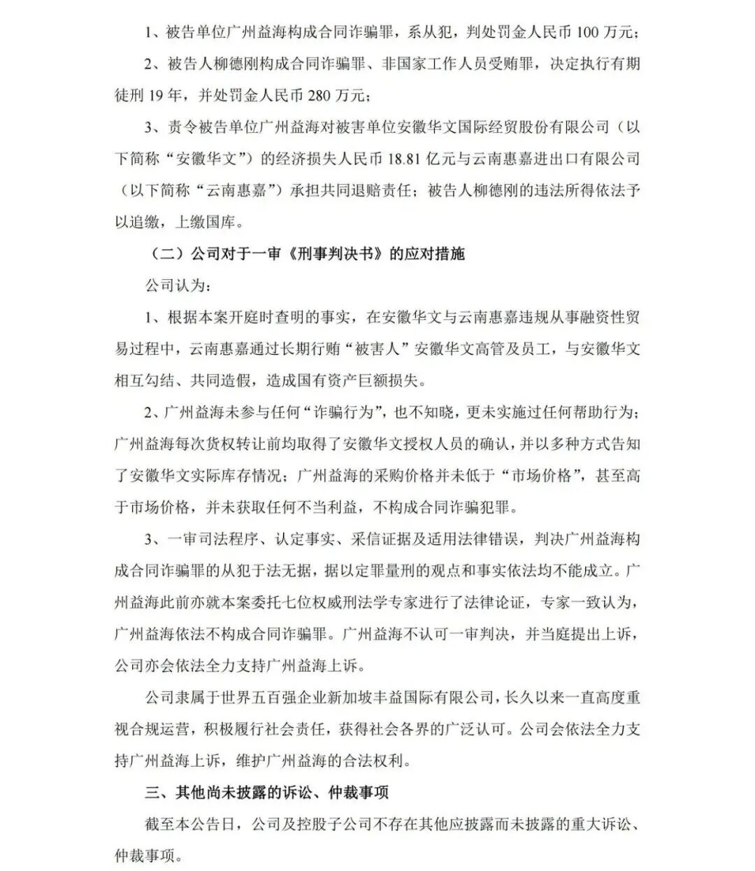 一审判决结果显示,广州益海构成合同诈骗罪,系从犯,判处罚金100万元。对安徽华文国际经贸股份有限公司的经济损失18.81亿元,广州益海与云南惠嘉进出口有限公司承担共同退赔责任。