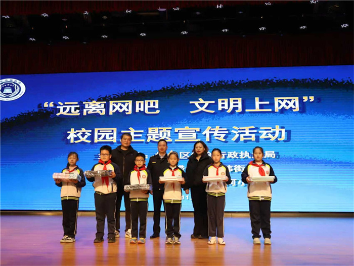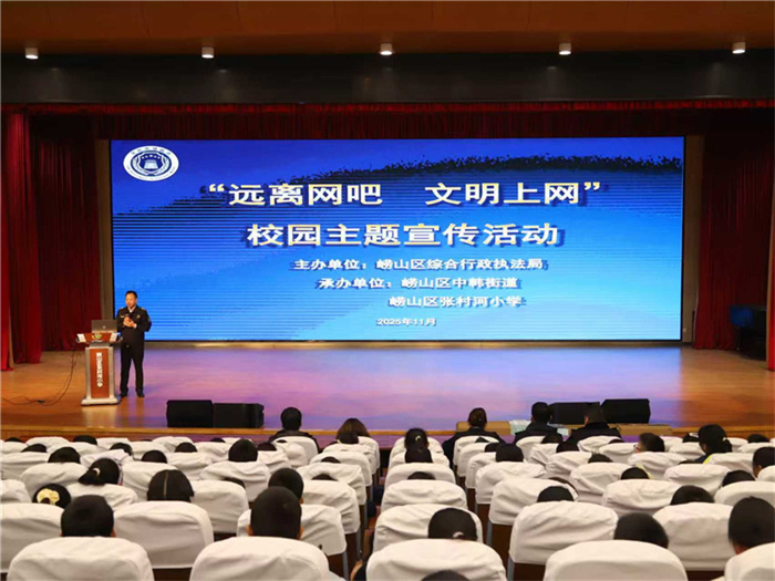 为切实加强中小学生预防网络沉迷教育,引导学生树立“文明上网、绿色上网”意识,11月26日,崂山区综合行政执法局联合中韩街道办事处在崂山区张村河小学举办2025年“远离网吧、文明上网”校园主题宣传活动,该校100余名师生参加此次活动。