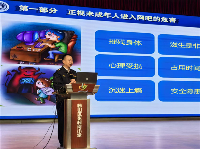 活动伊始,全体师生共同观看了网络沉迷主题纪录片《网瘾少年》。影片通过真实案例与生动画面,直观呈现了网络沉迷对青少年身心健康、学业发展的严重影响,引发同学们的深入思考。随后,执法人员围绕《中华人民共和国未成年人保护法》《互联网上网服务营业场所管理条例》等法律法规,开展“案例拆解+法条解读”主题宣讲,重点讲解了“未成年人进网吧的潜在风险”“网络的合理使用边界”“科学防沉迷实用方法”三大内容,结合实际案例剖析网络使用的利与弊,引导学生善用网络拓展知识、提升素养。
