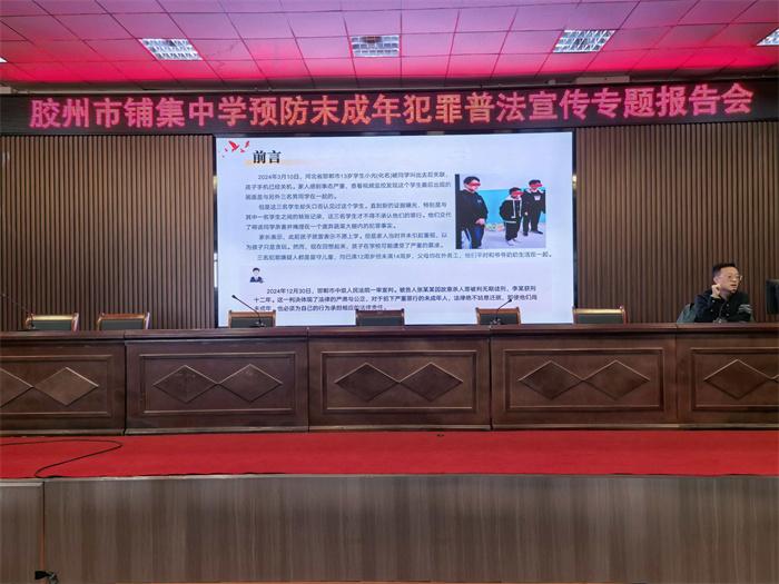 为深入贯彻落实《中华人民共和国法治宣传教育法》中关于青少年法治教育的相关要求,切实增强青少年法治观念和自我保护意识,有效预防未成年人违法犯罪,筑牢校园安全防线,11月28日,胶州市司法局铺集司法所联合胶州市蓝马甲普法志愿队讲师、山东诚功(胶州)律师事务所王晓峰律师走进铺集中学,开展以“学法知法守法 远离违法犯罪”为主题的普法宣讲活动,为该校200余名师生带来了一堂生动且深刻的法治教育课。