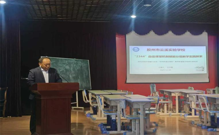 胶州市云溪实验学校江大强副校长代表学校介绍了《“2344”自信课堂机制赋能分层教学的实践探索》。他结合学校实际,从“2344”自信课堂机制、三原则五环节集备模式、费曼学习法推广工程、实施成效与展望四个方面对学校运用该机制赋能分层教学实践进行了详细的介绍。