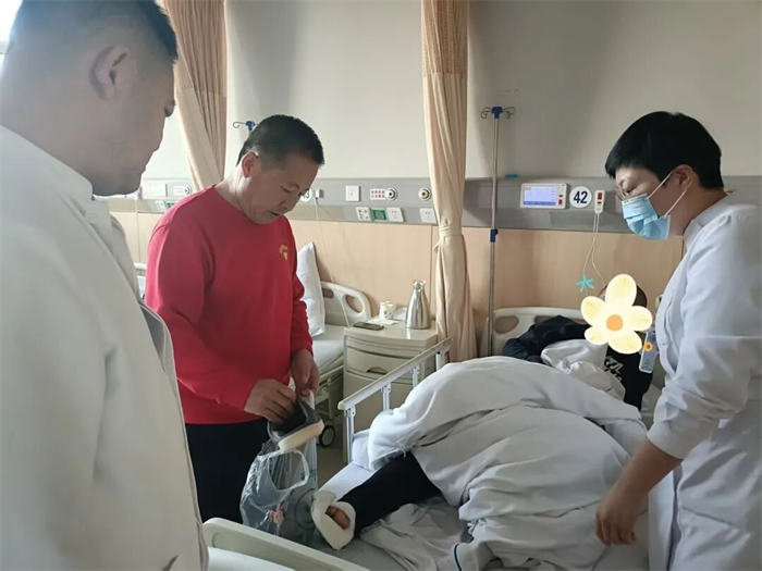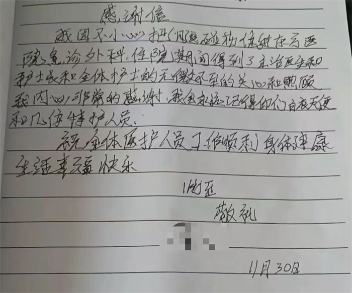出院当天,护士长帮患者换上干净的衣物,准备好崭新的拐杖,耐心叮嘱他出院后的注意事项,反复告知他日常防护与饮食禁忌。看着身上整洁的衣物,感受着医护人员无微不至的关怀,患者紧紧握着护士长的手说:“我内心无比感激,在东方医院我遇到了很多好人,护士每天悉心的护理,护士长亲切的问候,大夫为我签担保协议,政府为我出钱治病,大家都在积极地帮助我,让我能很好地恢复!胶州真是一个充满人情味的地方!”患者留下感谢信一封,承载着最深的感动;平凡的瞬间,定格着医者的大爱。