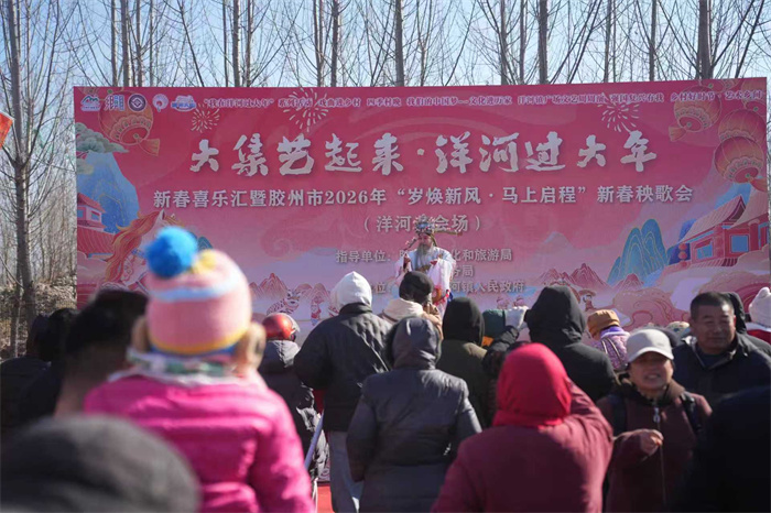 鼓乐齐鸣庆佳节,民俗展演闹新春。2月8日,胶州市洋河镇冷家村的乡村大集上人头攒动,热闹非凡。伴随着激昂的锣鼓声和欢快的秧歌舞,“大集艺起来・洋河过大年”新春喜乐汇及胶州市2026年新春秧歌会(洋河分会场)正式启动。这场盛会不仅拉开了为期一个多月的“我在洋河过大年”系列活动的大幕,更将民俗文化、乡村消费与公益服务巧妙融合,为市民游客端出了一道丰盛的文旅“大餐”。