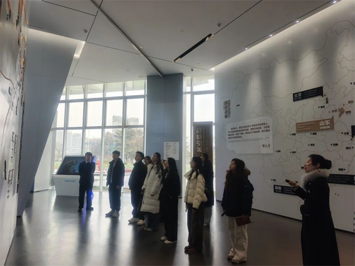 在青岛自贸片区规划展示馆,52平方公里的沙盘模型让同学们眼前一亮,四大功能区的联动格局清晰呈现。实践团通过一站式参观体验,系统了解了青岛自贸区的发展历程、资源分布和未来规划。从片区的战略定位到产业布局,从政策创新的举措到落地的成果案例,一张张规划图、一组组亮眼数据,让同学们跳出书本,清晰把握了青岛自贸区的发展潜力,也对“制度型开放新高地”的建设内涵有了更直观、更立体的认知。