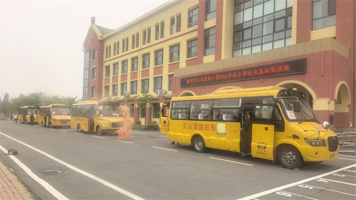 为切实增强学生消防安全意识,提升乘车学生应急逃生与自我防护能力,筑牢校园及乘车安全防线,4月17日,青岛胶州温馨校车有限公司联合胶州市慧海小学开展校车消防应急疏散演练活动。本次演练共动用7部校车,500余名乘车学生参演,沉浸式学习安全逃生知识和技能。