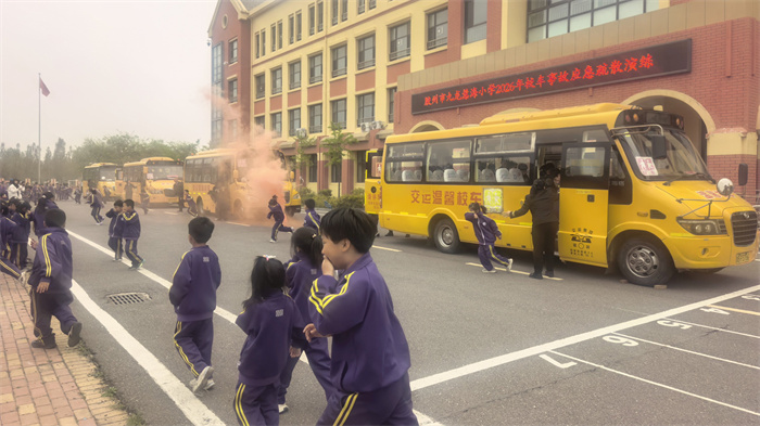 随着模拟烟雾弹燃起,校车消防应急疏散演练正式启动。在现场老师和校车照管员的有序引导下,学生们迅速捂住口鼻、弯腰低姿,按照预定路线,从校车前后安全门快速、有序撤离至校园安全区域。撤离完成后,照管员第一时间清点学生人数,确认全员安全撤离,整个演练过程紧张有序、规范高效。